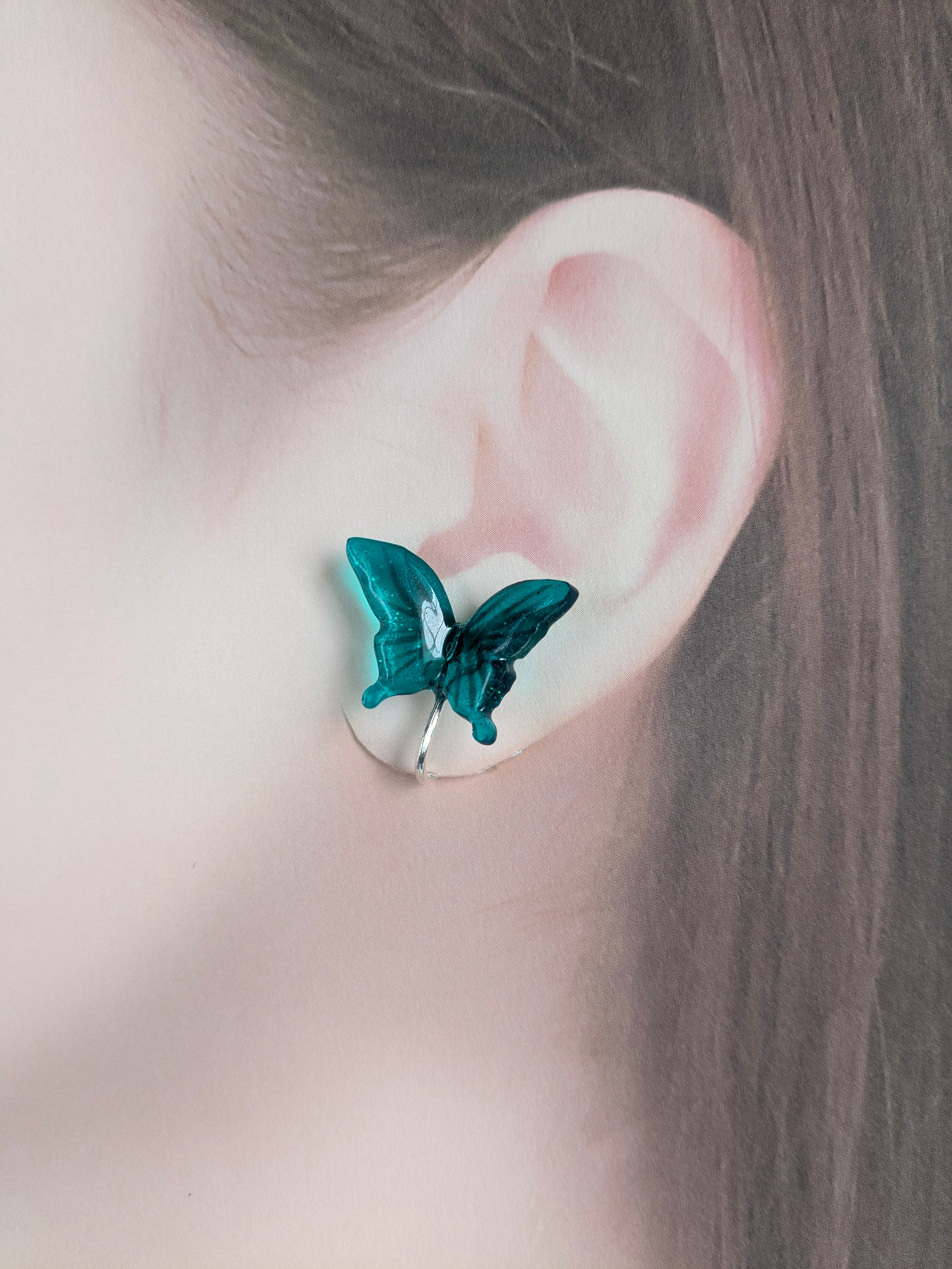 エメラルド色の蝶々のレジン製のイヤリングです。