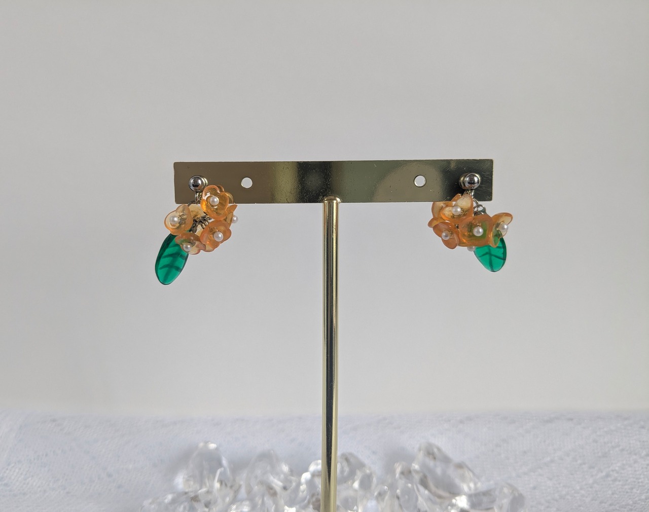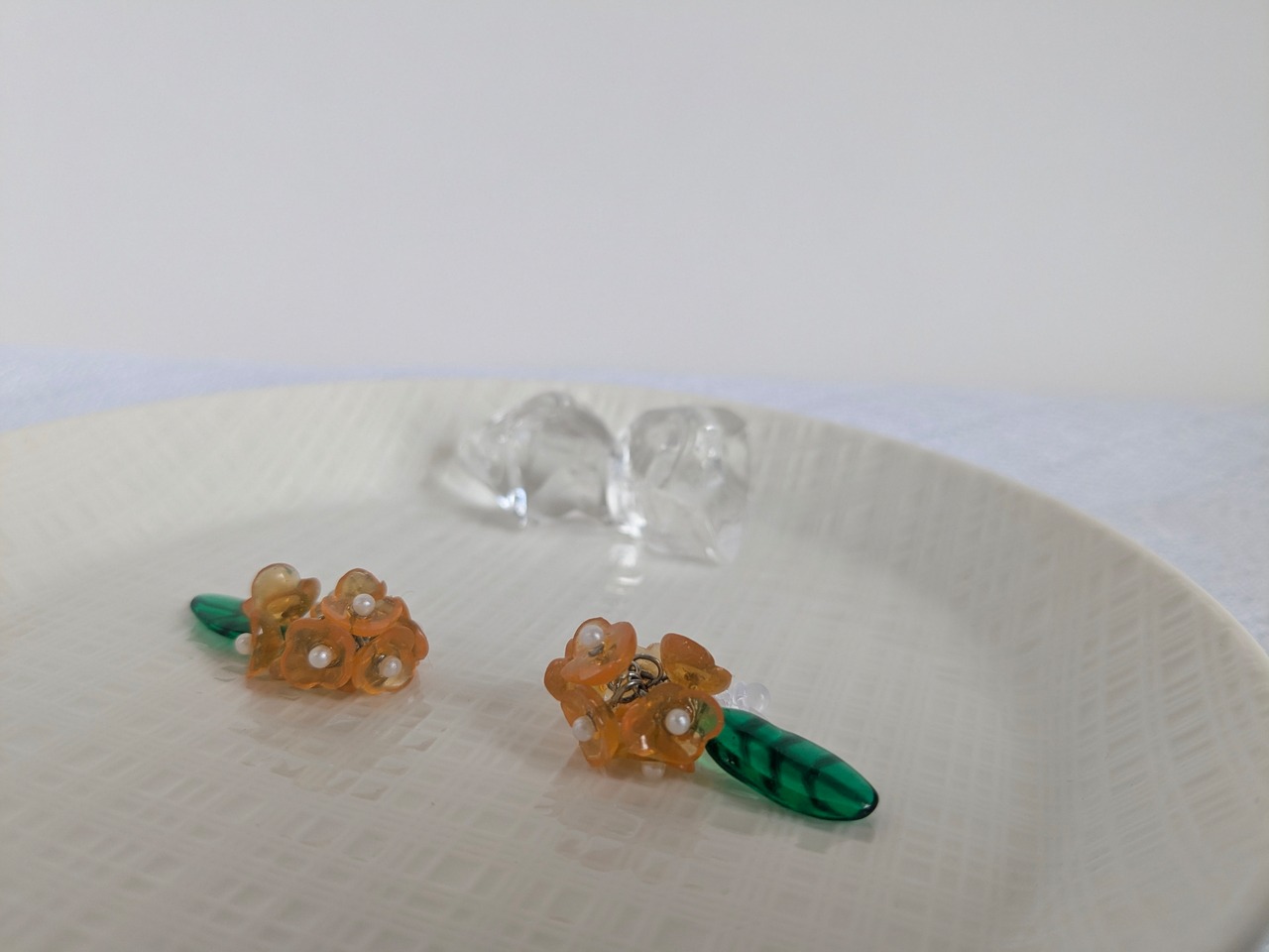 耳元で揺れる金木犀の花は、秋のシンプルなコーディネートのアクセントとしてだけでなく、特別な日の装いにもぴったりです。