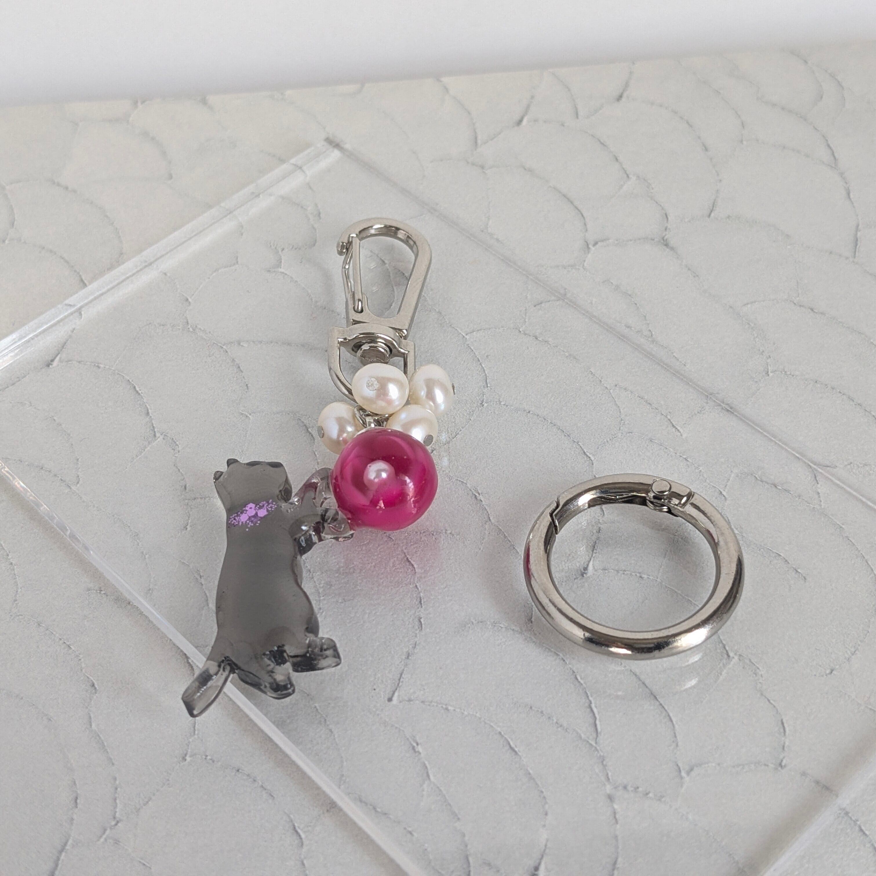 ワンタッチで付けられるカラビナでカバンなどの持ちての部分に通せば簡単にチャームを付けられて便利です。
