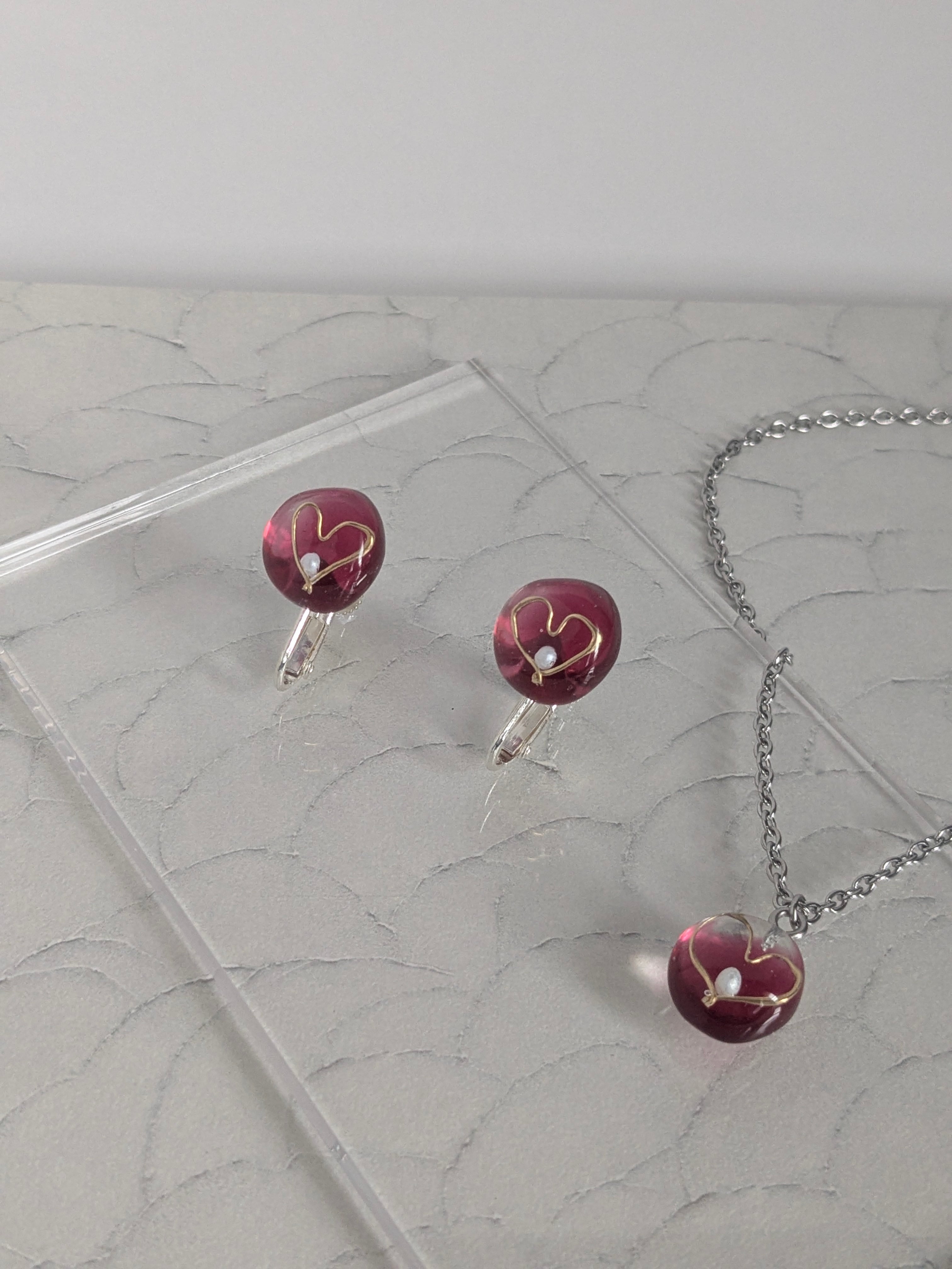 透明の中にボルドーカラーと不揃いのハートが色々な角度から見ると色々な表情があり見てて飽きません。
