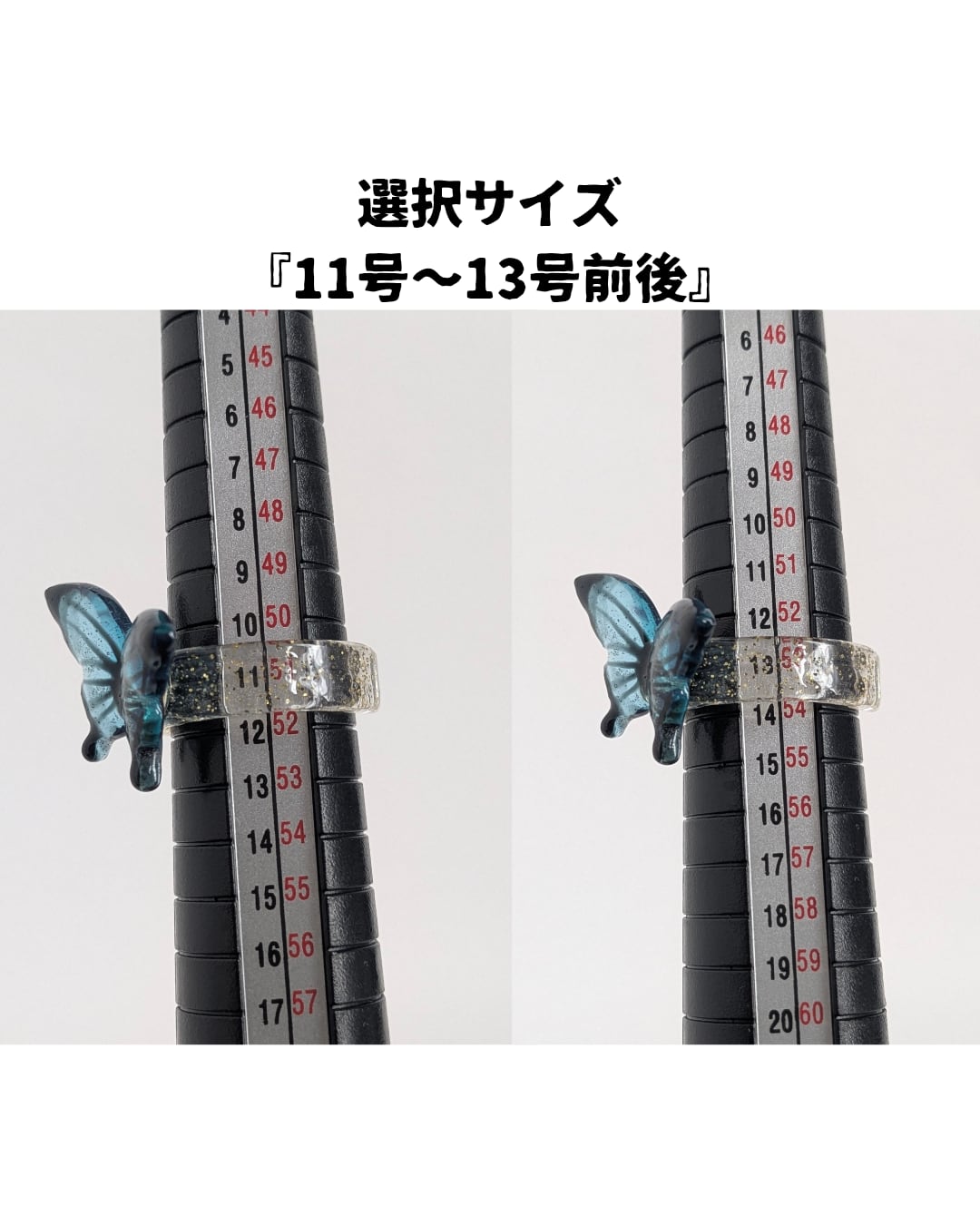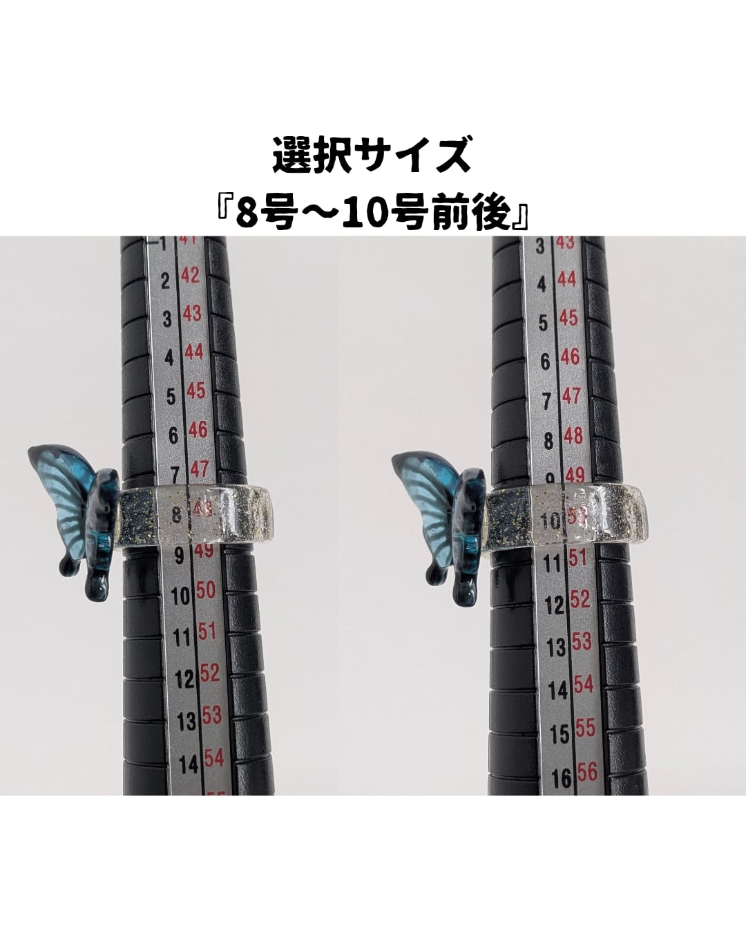 リングの部分もレジンにして幅を太くし、切り込みを入れる事で『8号〜10号前後』と『11号〜13号前後』の2種類のサイズ展開にしお客様にサイズを選択して頂くデザインにしました。