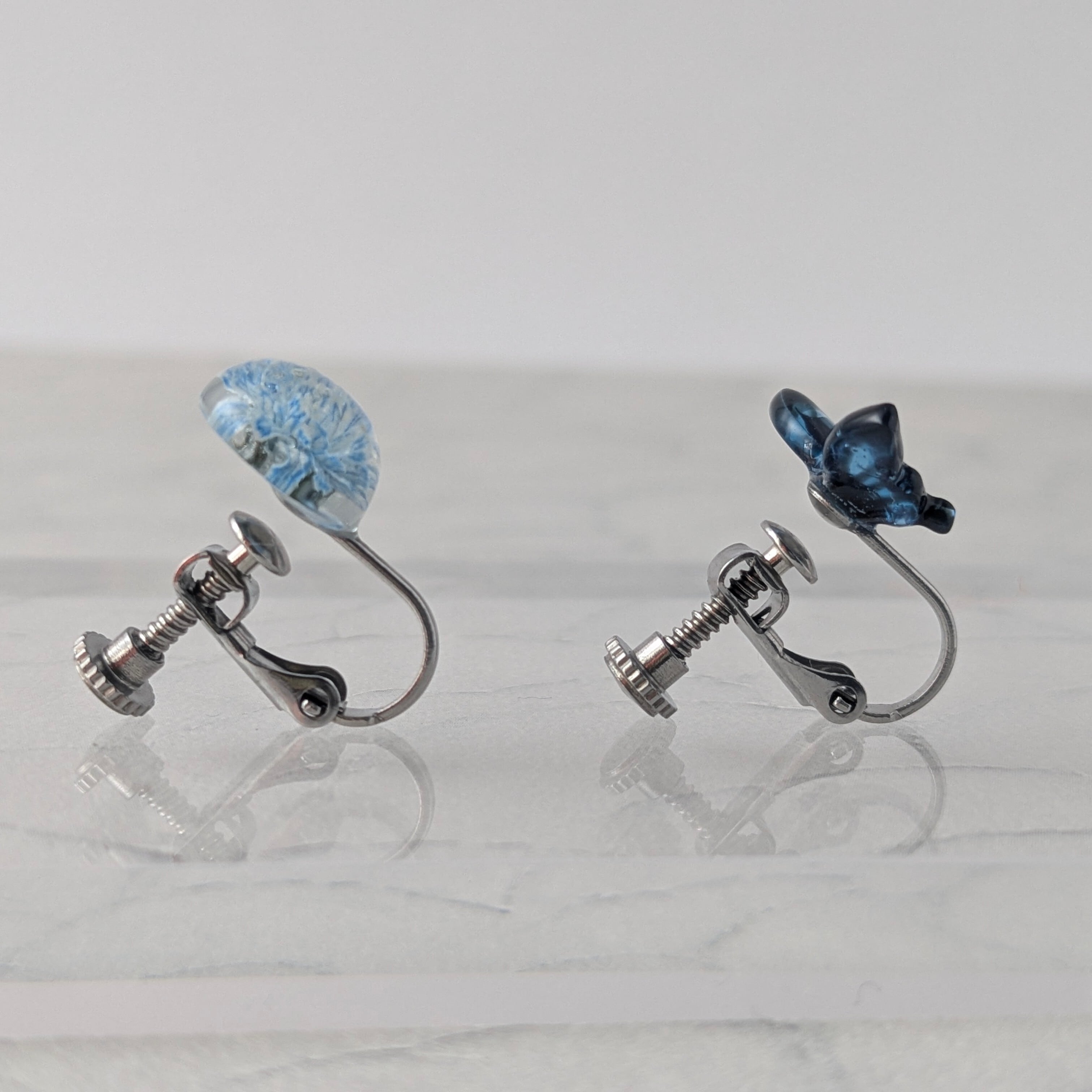 儚い透明の中に淡い青のドライフラワーのかすみ草を組み合わせたアシンメトリーのイヤリングです。