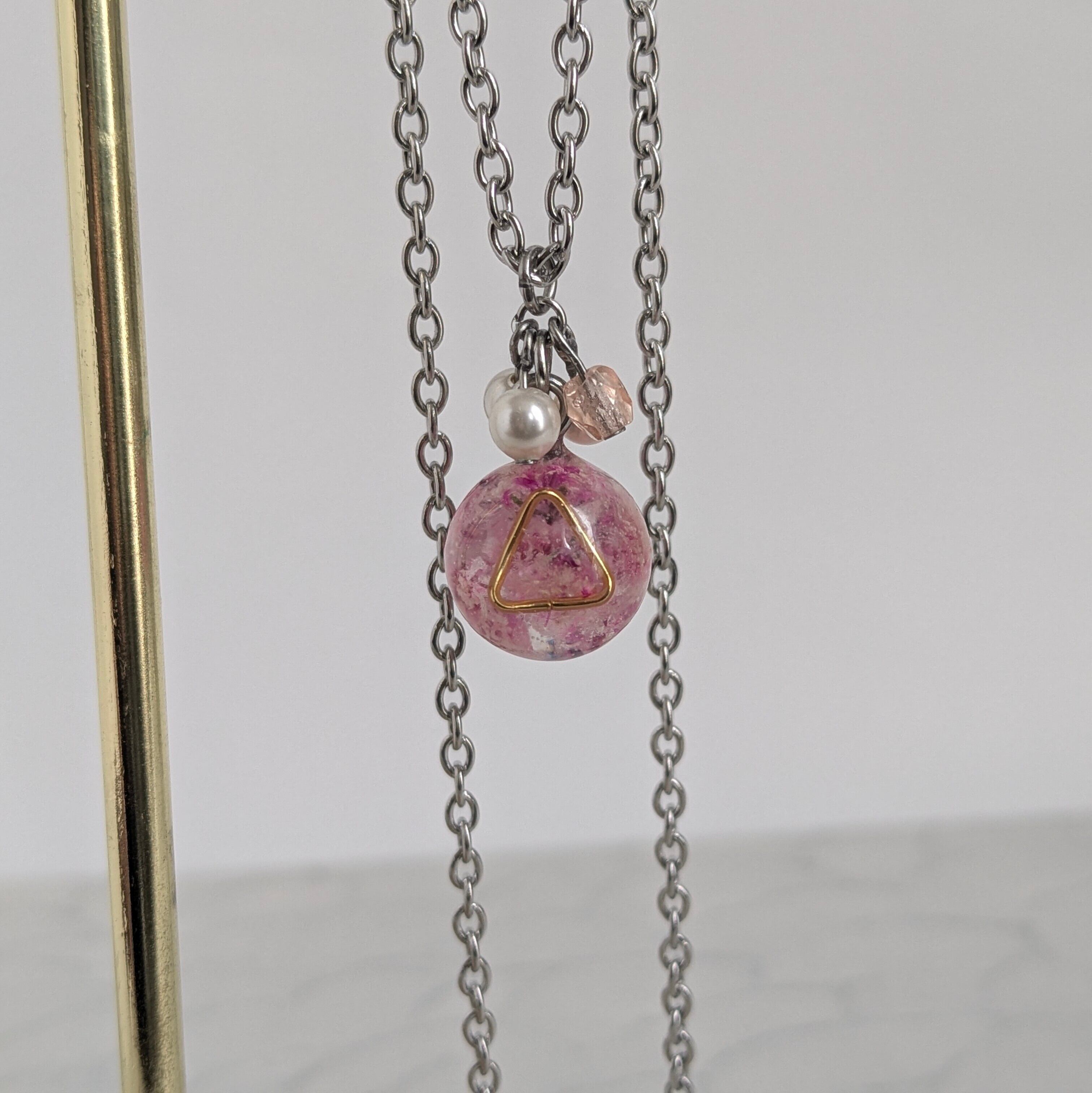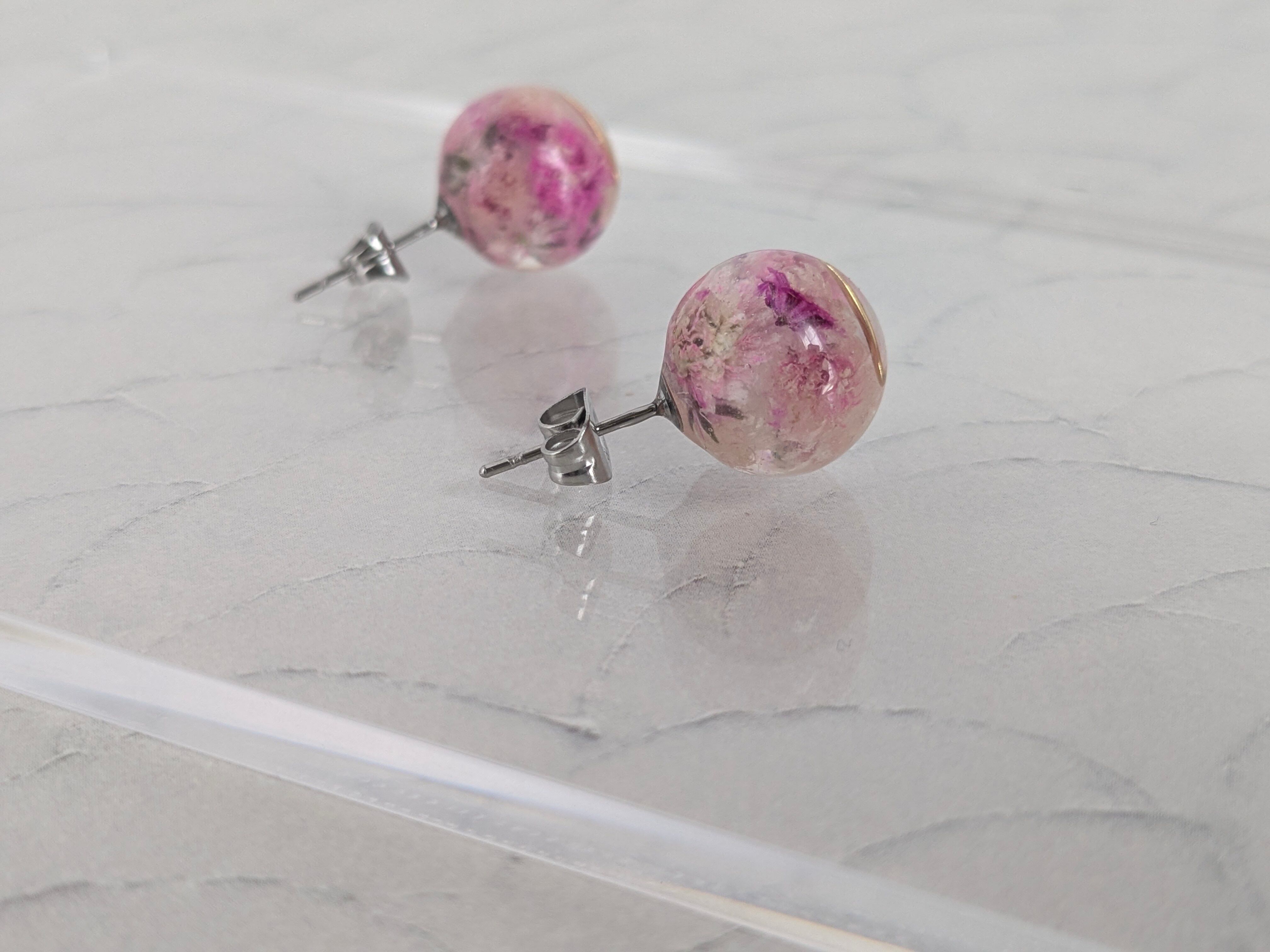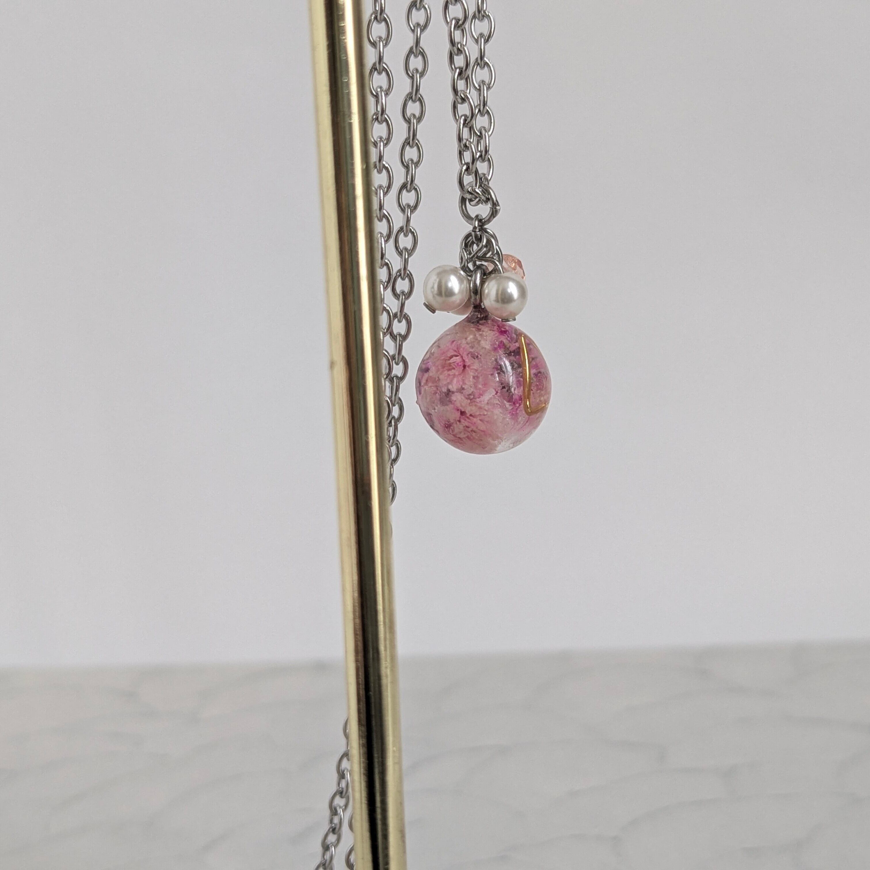 いちごみるく色のドライフラワーとゴールドのトライアングルを閉じ込めたアクセサリーシリーズです。